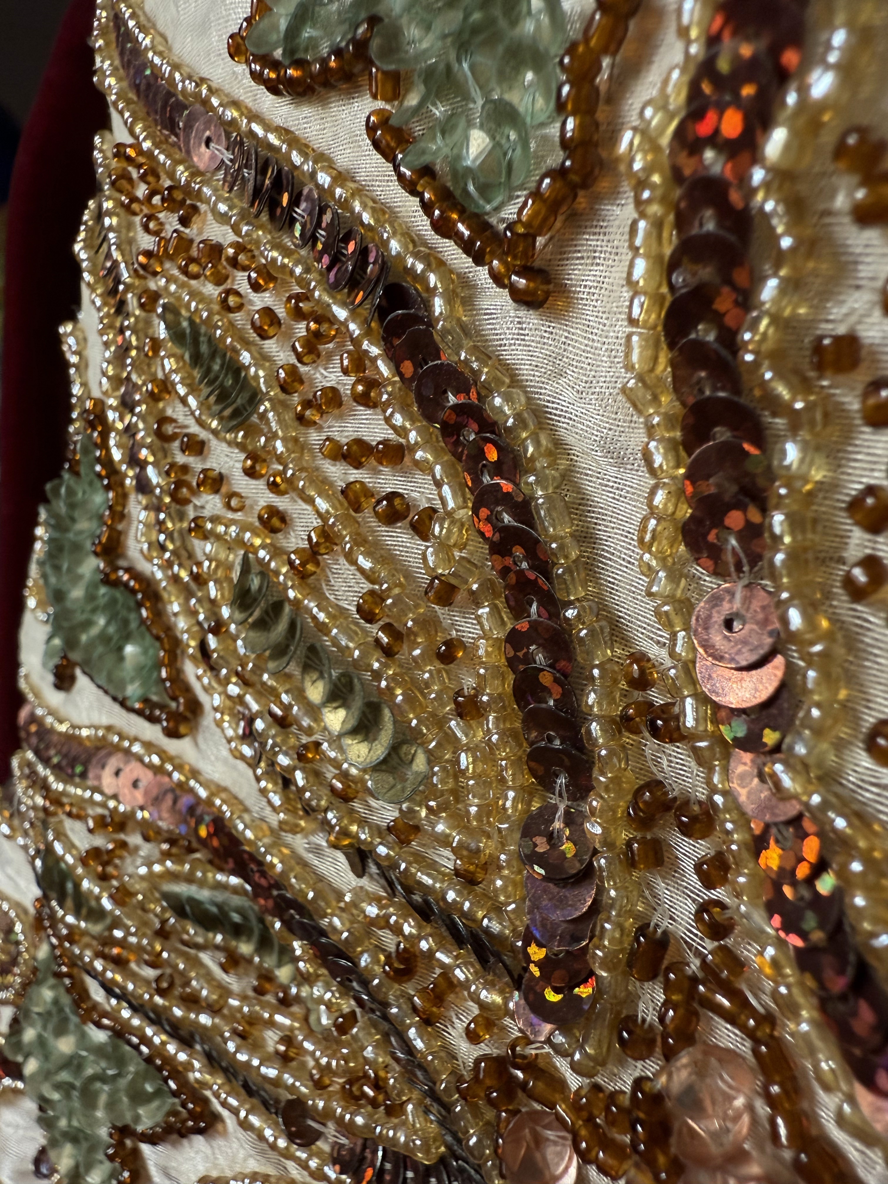 Pakistanische Perlen Dieser Blouson ist ein Prachtexemplar. Die alte Perlenstickerei auf weißem Organza ist ein Stück aus Pakistan. Gefunden auf einem Markt in Lahore. Die Stickerei wurde nicht nur mir Roccaille- und Holzperlen, sondern auch mit Pailletten geschaffen. Da Organza ein sehr delikates Material ist, habe ich die Vorder- und Rückseite komplett unterstützt, indem ich die Lage der Stickerei mit einem festen Unterstoff vernäht habe. Die Ärmel sind aus burgunderrotem Seidensamt. Größe 38.