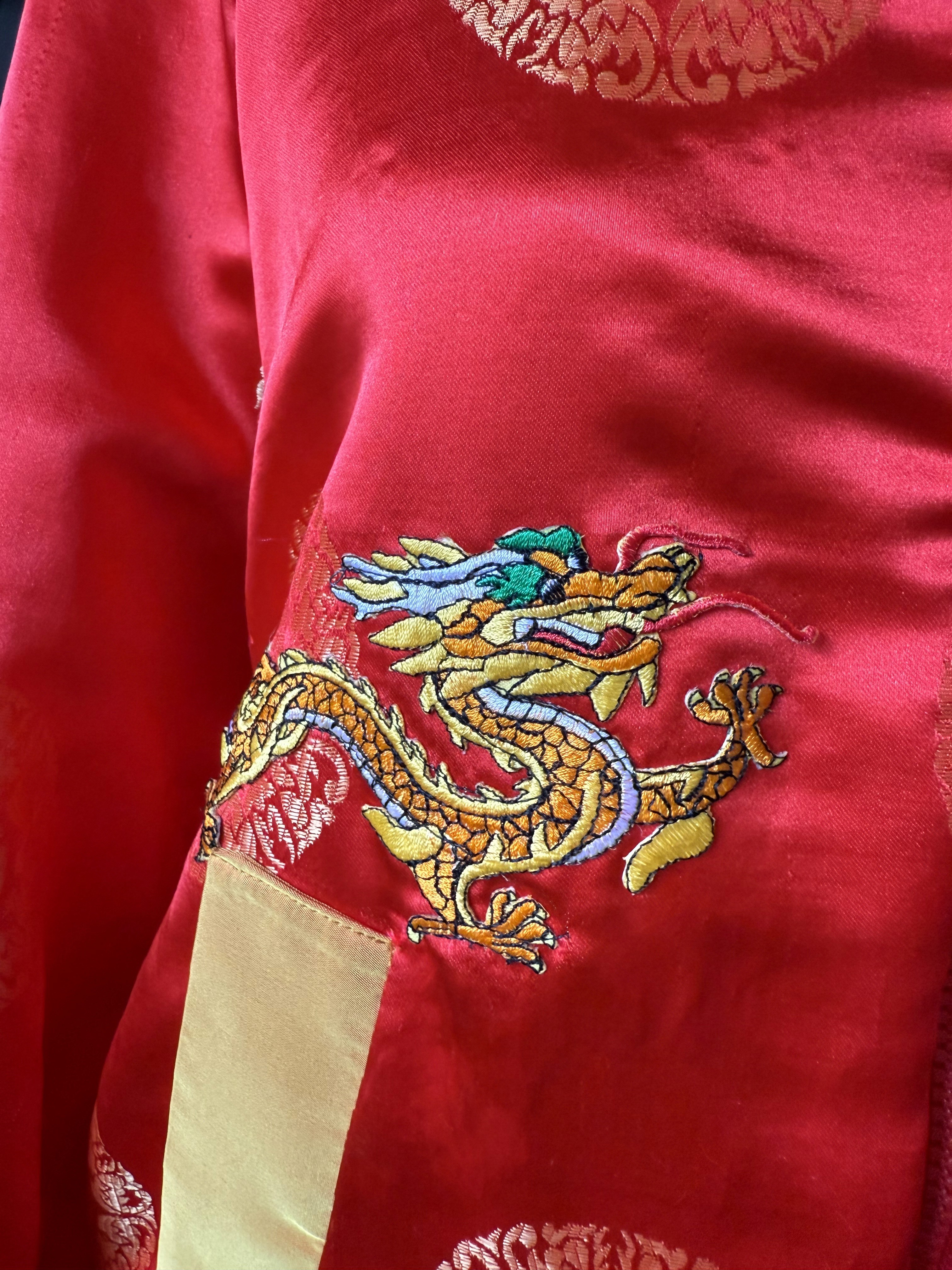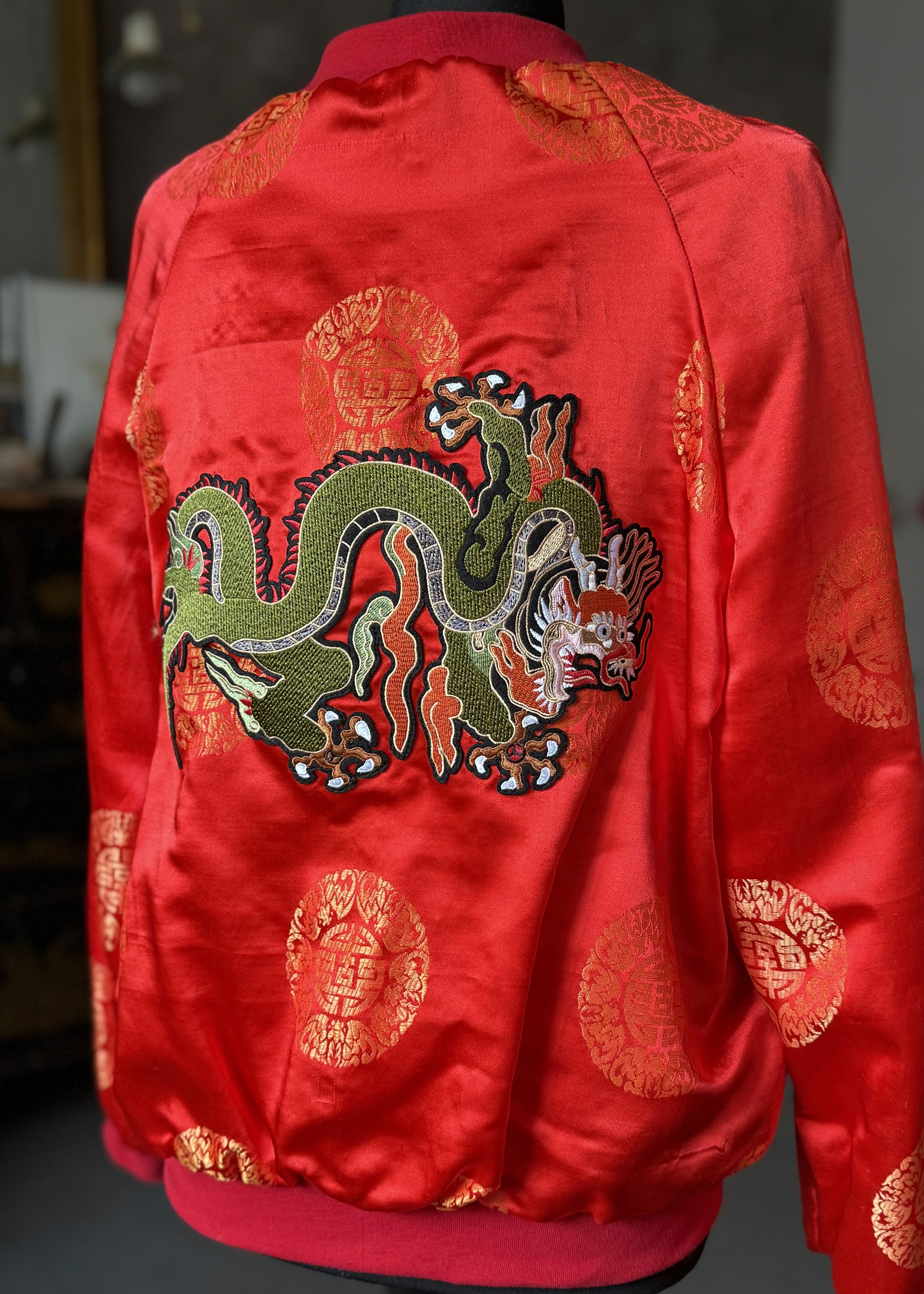 Seide aus Vietnam Diese leuchtend orange-rote Seide mit klassischem Emblem-Muster hat ihren Ursprung in Vietnam. Der leichte Stoff trägt einige „Drachen“-Patches. Für die Taschenleisten habe ich gelbe Shantung-Seide gewählt. Größe 38.