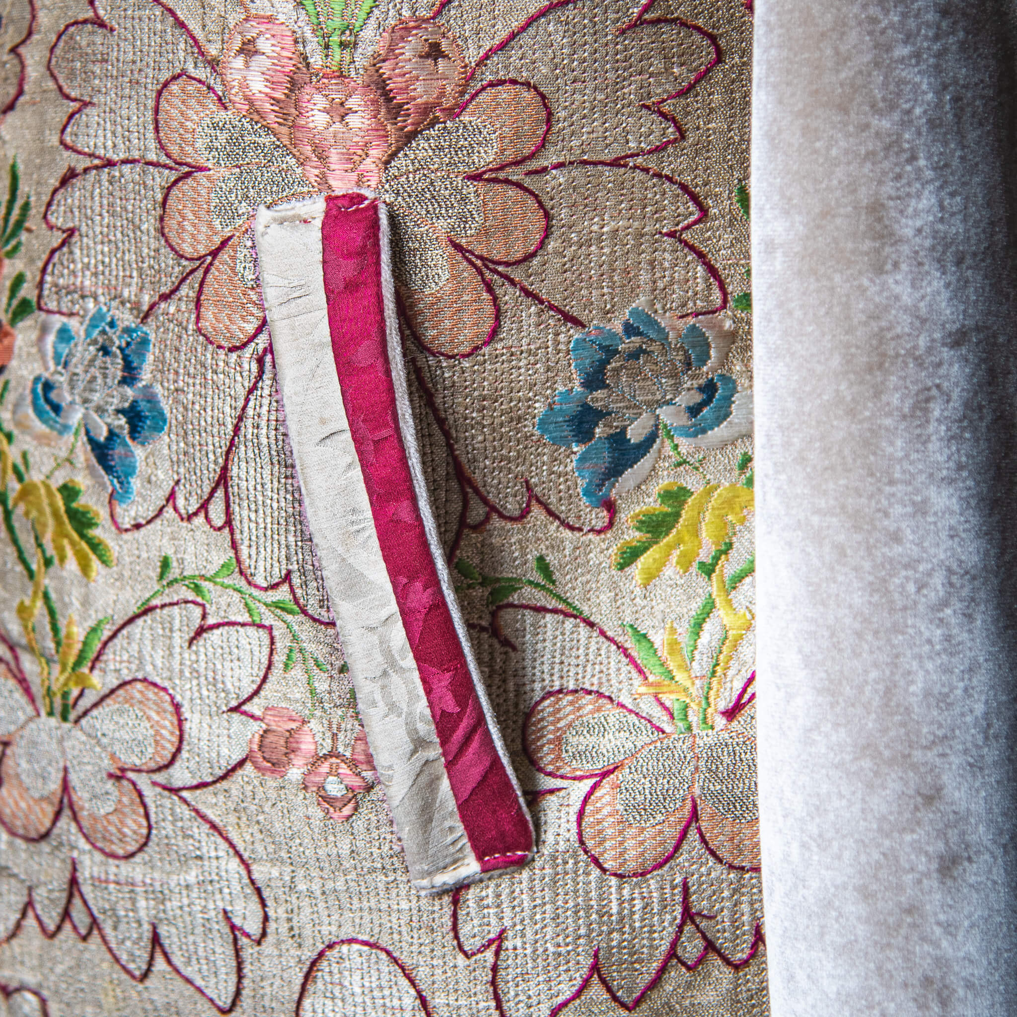 Der Stoff dieser Jacke ist mit Gold- und Silberfäden üppig bestickt. Es ist ein antikes Stück, das ich so nie wieder zu Gesicht bekommen habe. Die Ärmel sind aus sehr glattem, weichen Samt. Die Leiste der Taschen sind aus antiker Seide, kräftigem bordeauxrot.
