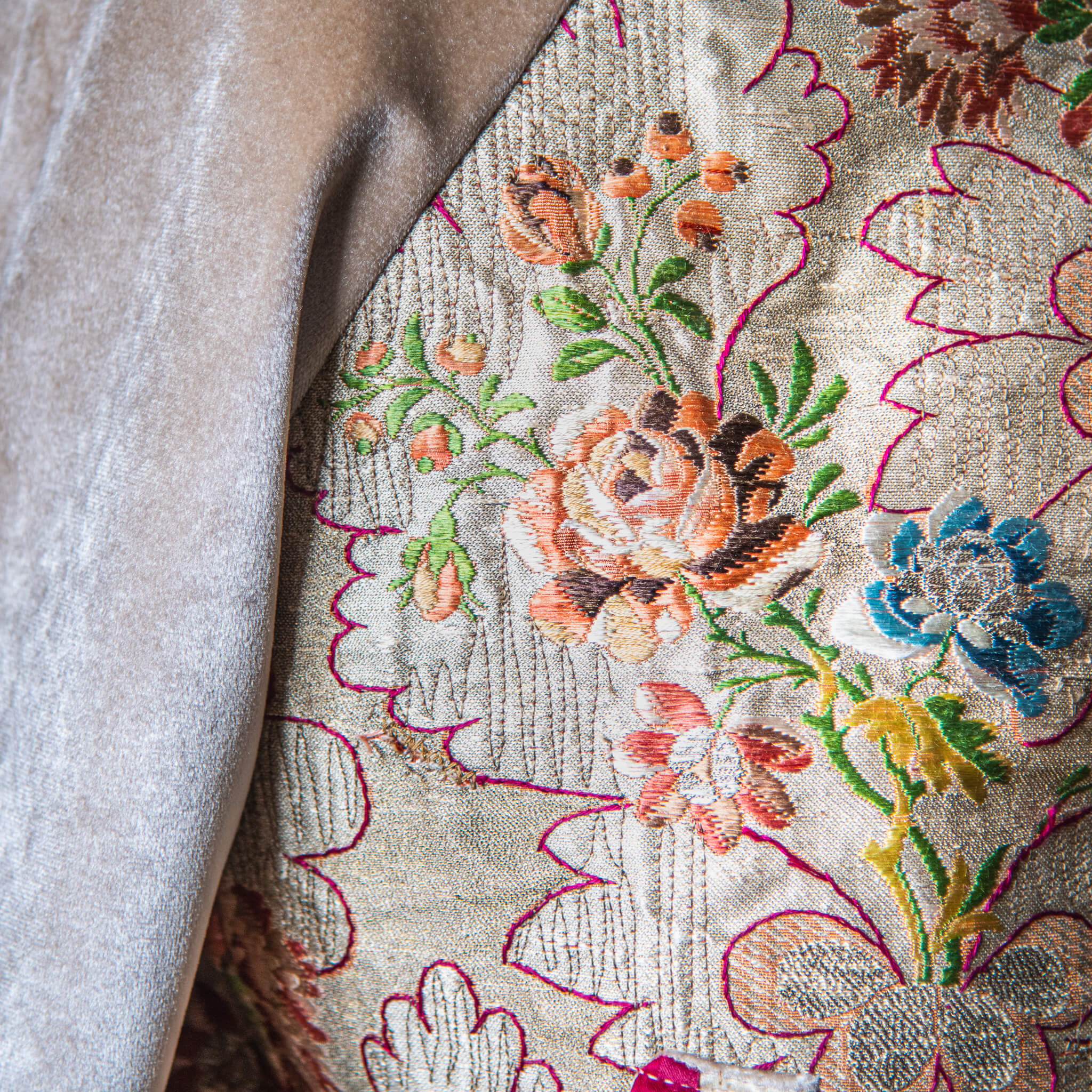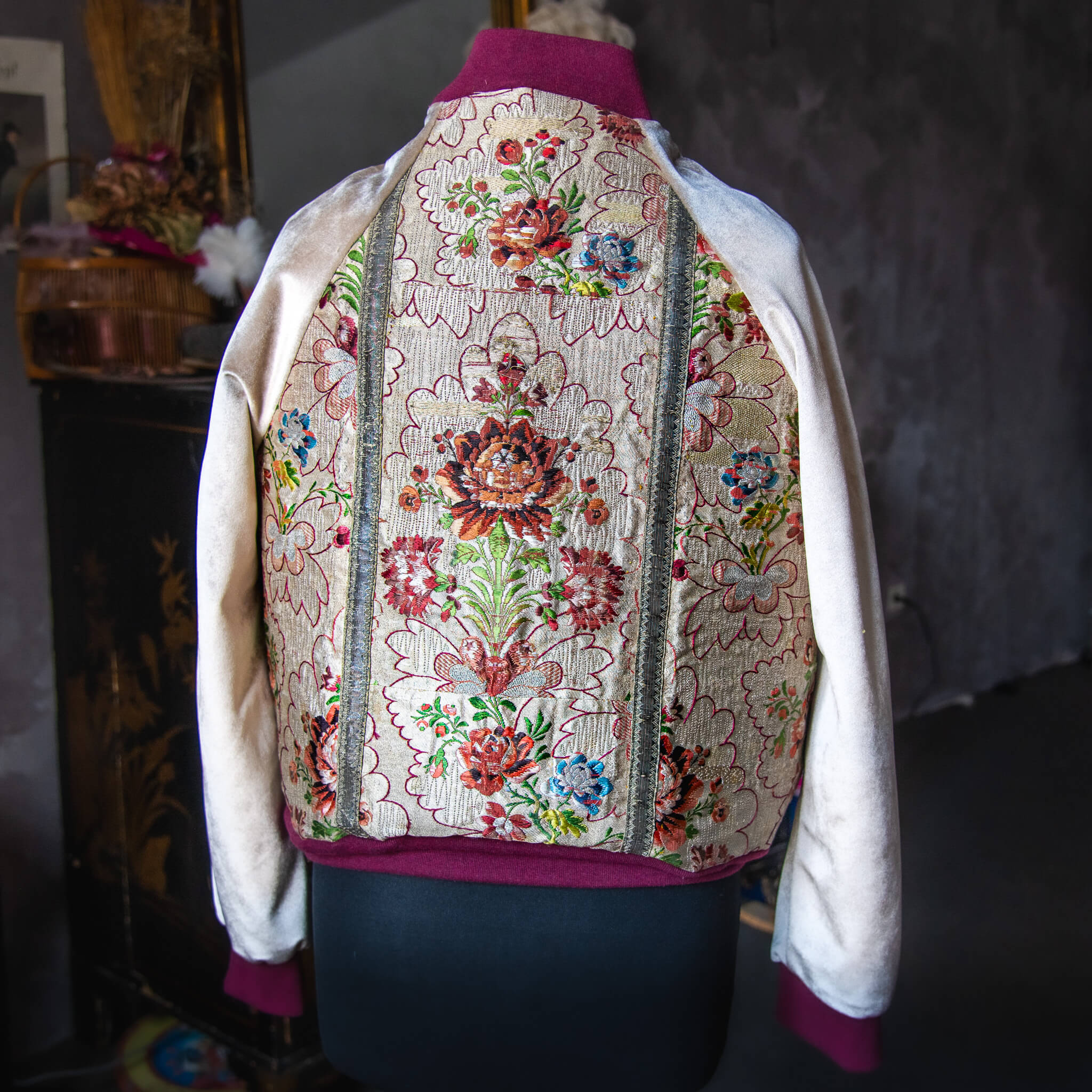 Diese Jacke ist zum einen aus besonders seltenem, antiken Brokat mit goldenem und silbernem Muster. Eine ganz speziell gemusterte Seide habe ich als Stoff für die Ärmel damit kombiniert. Die Leiste der Taschen ist eine bordeauxrote Seide, Teil eines antiken Tuches.